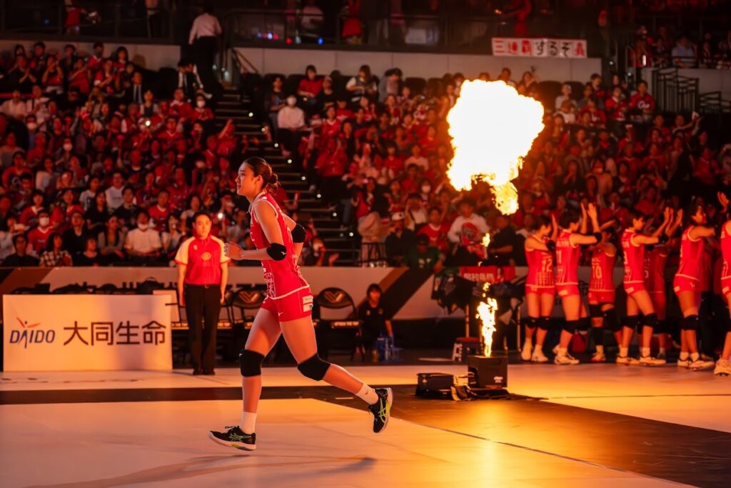 例えばBリーグだと天井から吊り下げ式の大型ビジョンがあってプレー中も映像を流せますが、それは選手が上を向くシーンがゴールくらいしかないから。センターでは見上げないからスクリーンが視界を邪魔をすることはないですしね。バレーボールは上を向くスポーツなので、プレー中にあまり動く映像を流せないんですよね(スコアくらいは出せますが)。あとけっこういろんなところを向くスポーツなので目に入って邪魔にならないようにということなのか、大型ビジョンはせいぜいコートの四隅の、少し離れたところにしか置けなくてプレー中の映像演出がしづらいんです。