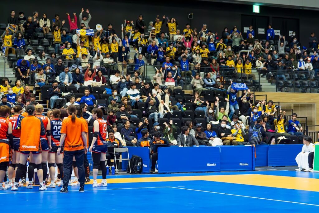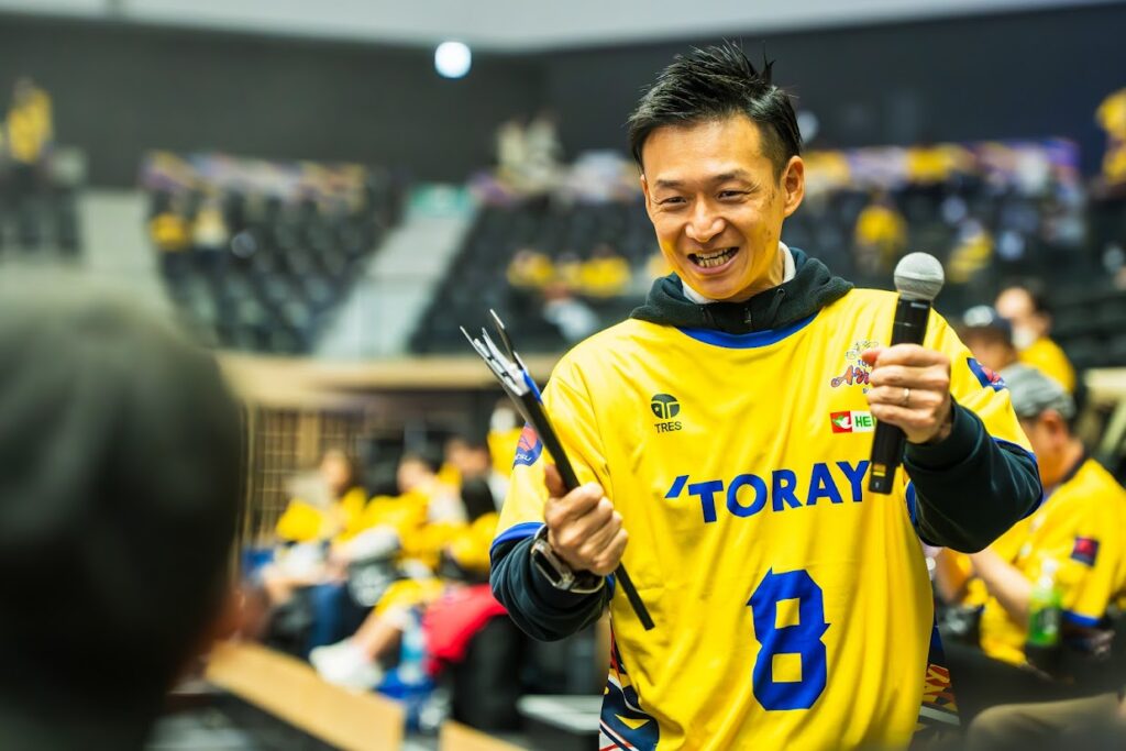 初日の土曜でコツをつかんだのか、二日目の日曜は席を離れてスタンドを中心に客席内を歩き回って煽ったり、マイクを向けて「GoGoアローズ!」を子供に言わせるなど、コートから離れた人や子供も呼び込んで会場全体を盛り上げようとされていたんです。日曜は前日のイエローユニデーの反動で観客も少なく、周りに観客が少なく静かに見ている人が多かったので、そういう人たちを巻き込むのはいいなあと思ってました。これは試合前に、みんなで手を出して円陣組もう、と呼びかけていたときです。
