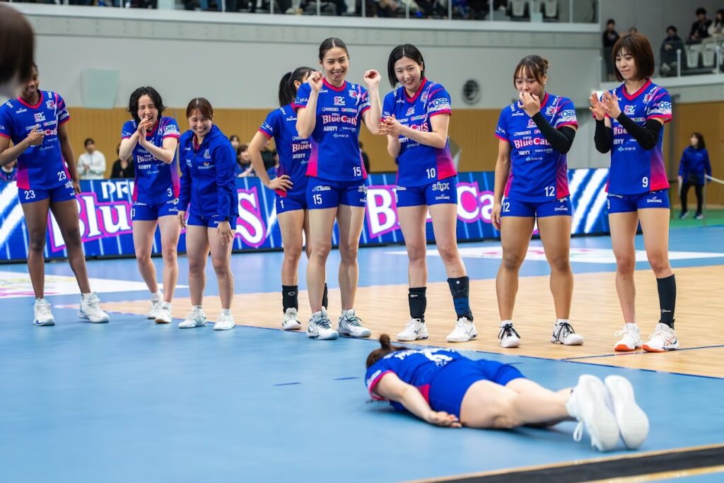 二日目のホーム最終戦は勝利を収めたのですが、その後のセレモニーで、今シーズンの選手を一人ずつ称えるスピーチも見事でしたし、メリーサ選手を忘れるという失態も彼女らしかったですが(右の写真は土下座…以上に謝っている様子です 笑)、会場全体をハッピーに包み込む様子はすごくいいなあと思いました。KUROBE時代からそこそこ長く見ている選手ですけれど、「こんな選手だったんや!」という驚きもありましたし、「いやあ、このチームのキャプテンにうってつけやなあ…」という思いもありました。