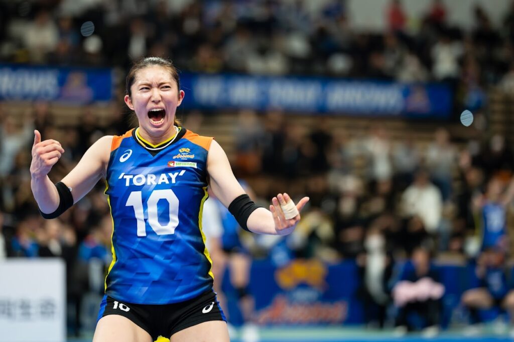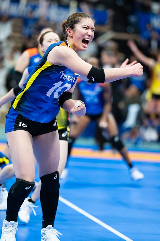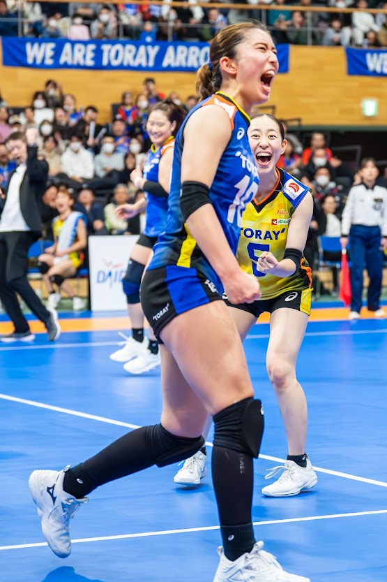 ね(笑)、こんな感じです。前から言ってますが「谷島里咲は縦で撮れ」です! まあ、快心のプレーでの喜びというよりは、会場の熱を上げようとしている部分もあると思います。ファン視点というかな。だからこちらまで熱くなるし、他チームのファンの人も激しいガッツポーズが印象に残っている、と言われることもありますね。まあ先輩にもいじられてましたが…(笑)。