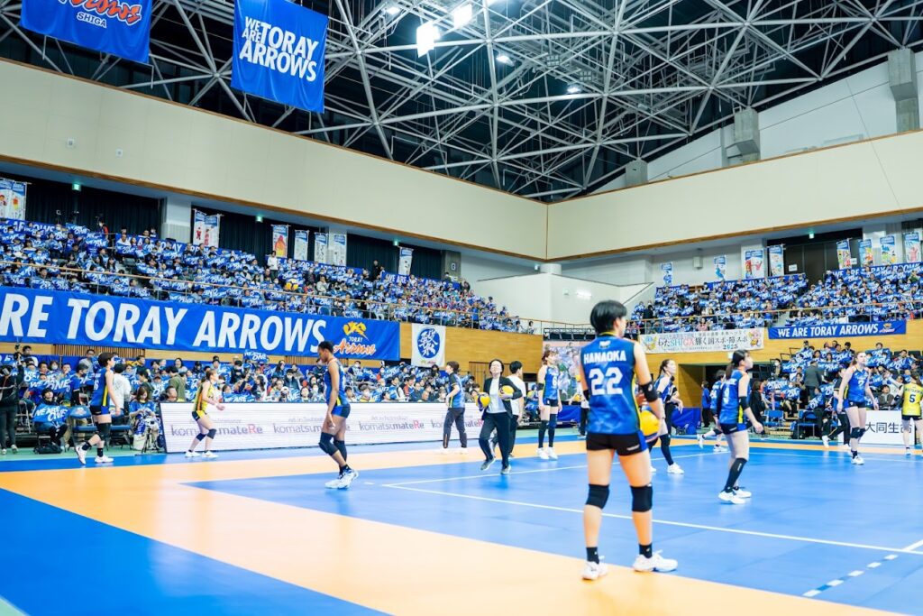 ところが、東レアローズ滋賀と「滋賀」がチーム名に入り、無料招待などの施策もあって「一度見に行ってみるか」という人たちが、実際ホームゲームに来て、その熱戦ぶり(実際フルセットが多かったです 笑)に惹かれて何度も足を運ぶようになって、やがてアウェイにまで遠征するようになった人や、自作で選手の応援ウチワを作ったり、得点王を独走していたヌワカロール選手の得点板(シッソメーター)を作った人、そしてアロッチのお面を作って被る子供たちまで現れたり。そうやって観戦が参戦になっていった地元の人たちをたくさん見たんです。