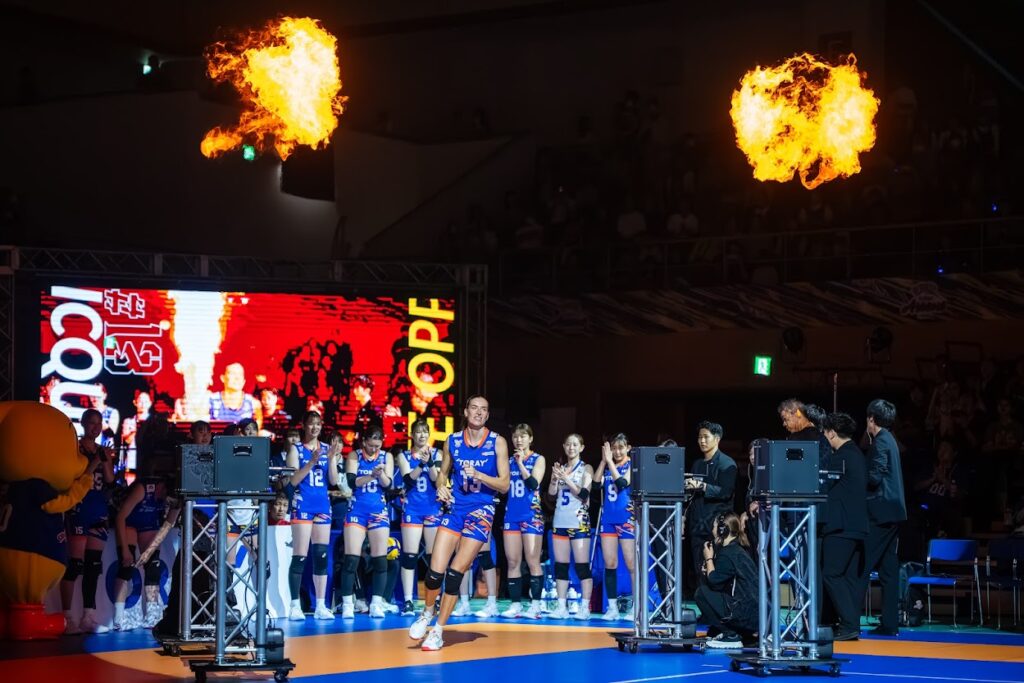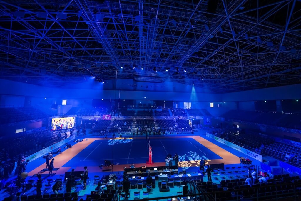 選手がボールを使ったウォーミングアップをするときは明るくなりますが、それが終わるとまた暗転。明るくなるのはスタメンの選手がコートに入って試合が始まるときです。また、第二セット後のインターバル中も暗転して、ウォーミングアップがはじまるときでもまだ暗かったりします。そんな風に、場内が頻繁に暗転するようになりました。