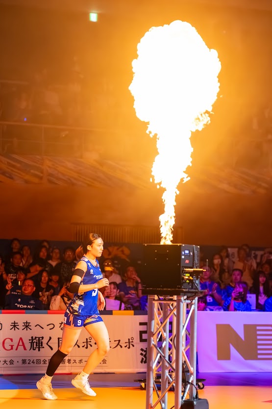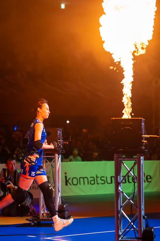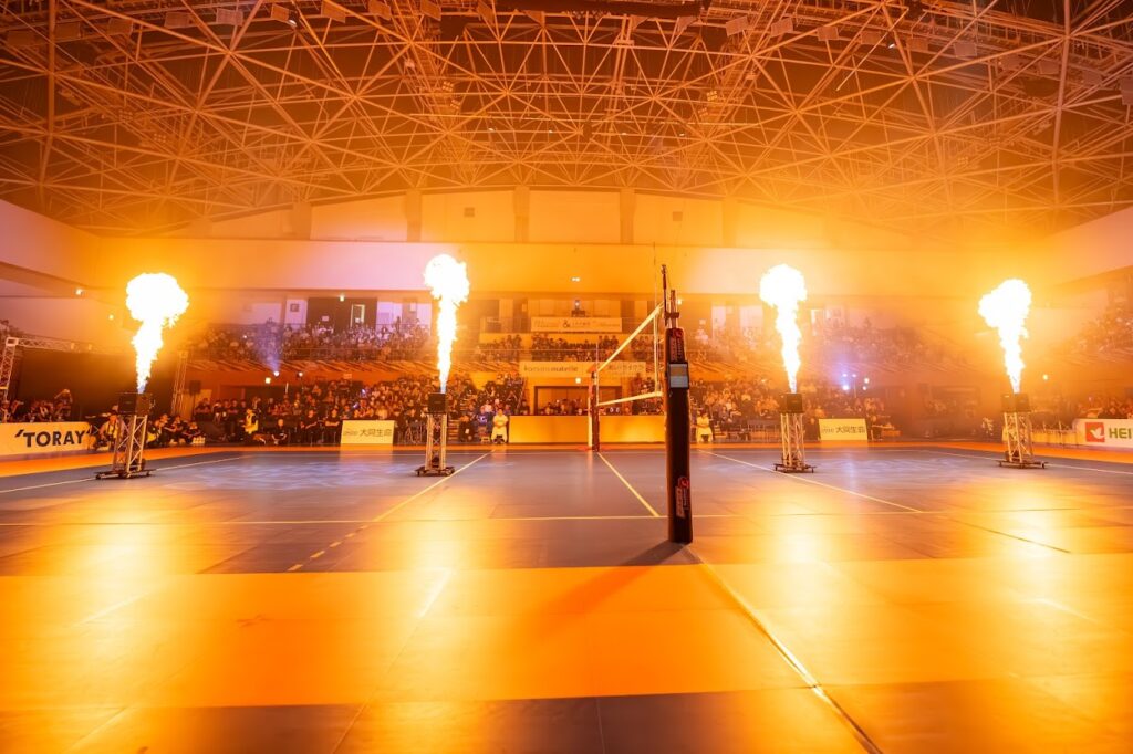この装置の中ってカセットガスが何本も入っているんですよね。爆発しないか不安になりますし、まれに炎が出てこないマシンがあるからなおさら。ちなみに試合前および第三セット開始前にはコートの真ん中で炎を巻き上げるのですが、離れていても熱が伝わってくるので、間近を通る選手はなおさらだと思います。