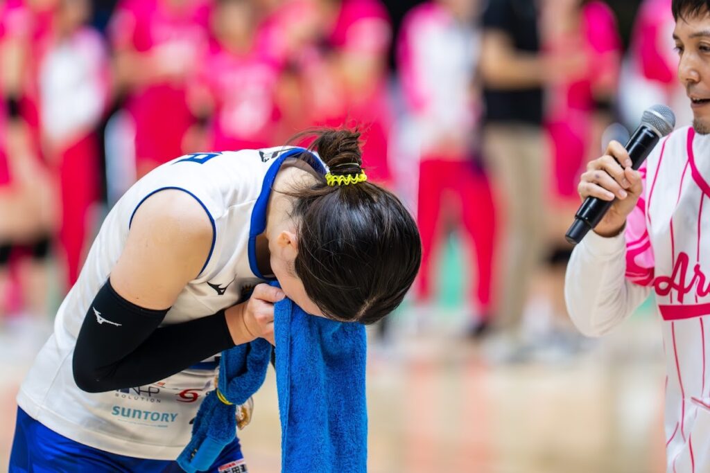 号泣する選手…。前日のアルテミスが、涙ぐんでいだ選手はいたもののどこかカラッとした明るさを纏っていたのとは対照的だった(代わりに監督が号泣していたけど…笑)。これが何より、2018年からの7年間のチームの歴史を物語っていた。そして、POMインタビューも前日と違って号泣。涙にくれるインタビューというのはこれまでも見てきたけれど、ここまで号泣度の高いインタビューは初めてだった。POMインタビューも笑顔にあふれていたアルテミスとは完全に真逆だった。