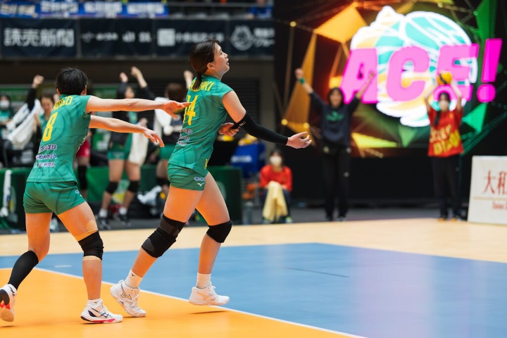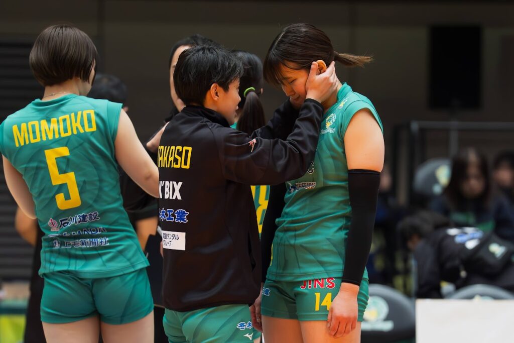 これほど、かけている言葉が想像できる光景もなかなかない。一回のミスでクヨクヨすることなんかないよ、今日はサービスエースもあったじゃない。自信もっていいんだよ。そんな言葉をキャプテンである髙相選手はかけたのではないか。何しろ第二セットのサービスエースではこのように背中を押していたのが印象的だった。実はあまり自分に自信を持てない選手だから、あえてこうして背中を押して讃えて自信をつけさせようとしたのでは…。