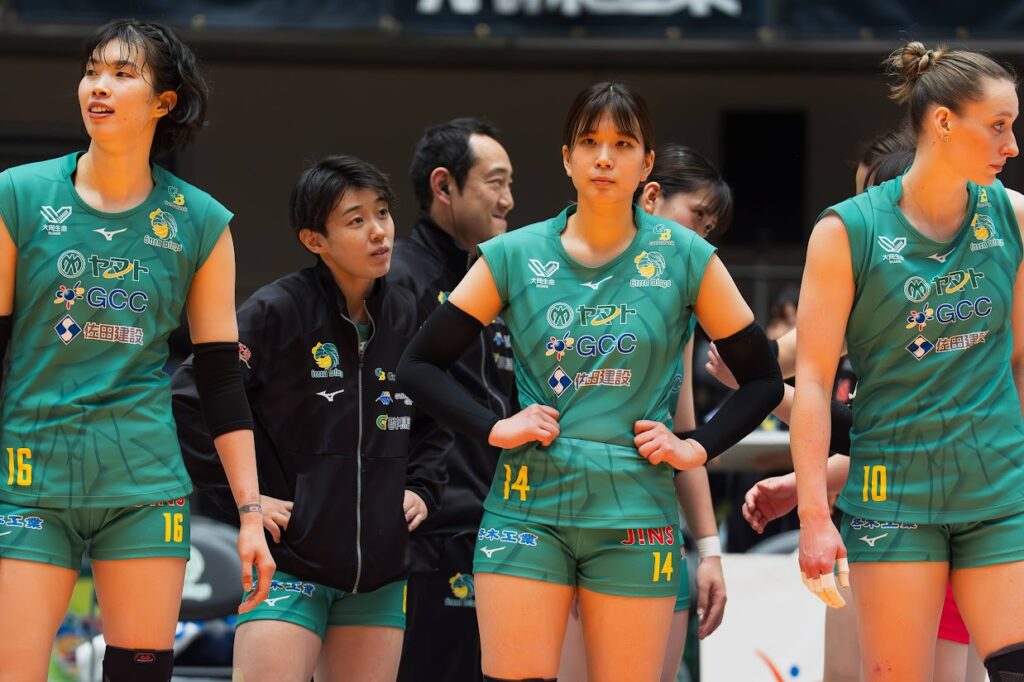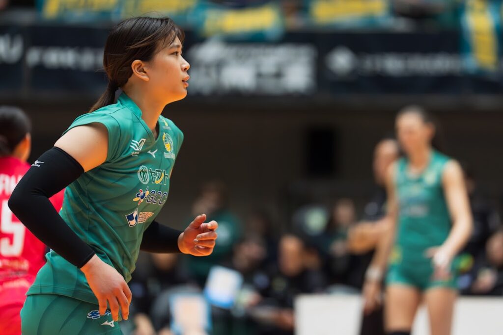1-2と刈谷リードで迎えた第四セットは一進一退の展開だった。いったんは13-17と中盤で4点差をつけられながらひっくり返し、24-22とセットポイントを奪ったもののデュースに突入と流れが目まぐるしく変わった。でも25-24と再び群馬がセットポイントを奪った、流れを引き寄せたそんな時。彼女はサーブをミスして25-25と再び追いつかれてしまう。
