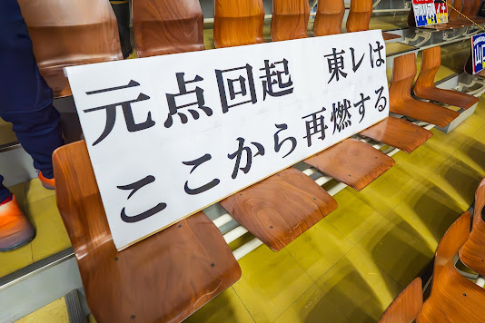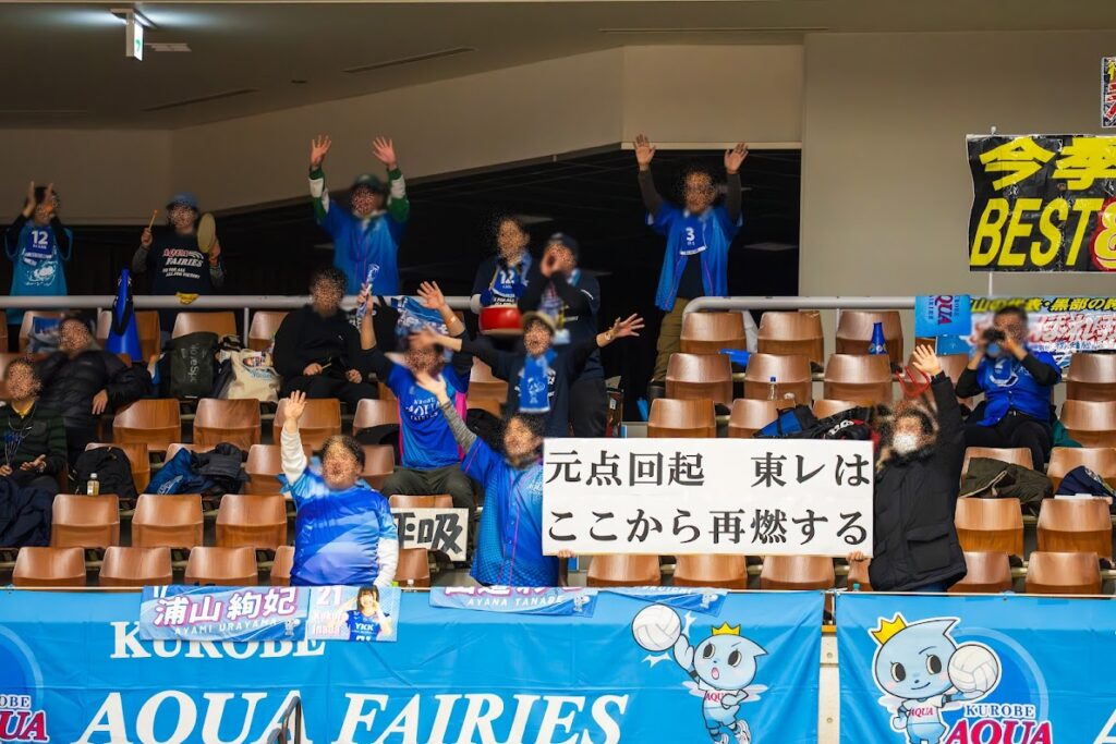 それは、試合が始まる前、終わった後では相手チームを迎え、そして称えるアクアファンの彼らが作り出す空気だった。彼らはホームゲームだからといって、どこかのチームみたいに決して相手チームの応援をつぶしてホーム一色にしたりしない(はい、容赦なくボリューム上げるウチのことですすみません)。さらには今回、日曜の試合後に東レを激励するメッセージを掲げてくれた。